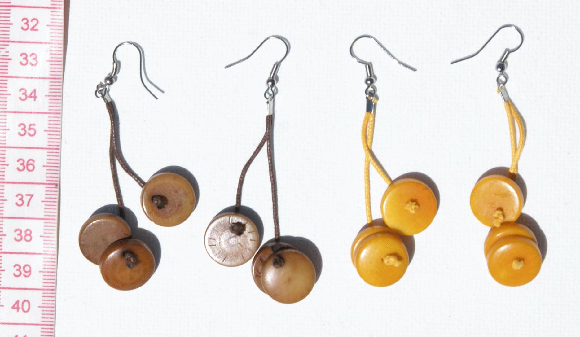イヤリングはタグアナッツの刻印とカラー3ワイドスライス手で構成されています。これらはイヤリングとして一緒に手作りされています。エクアドルの民族の部族のジュエリー。